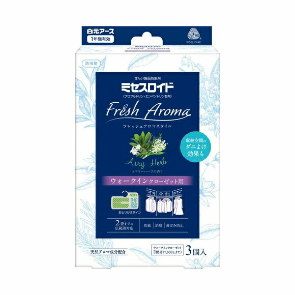 【30個セット】ミセスロイド フレッシュアロマスタイル ウォークインクローゼット用3個入 1年防虫 エアリーハーブの香りx30個セット【ヘルシ価格】【返品キャンセル不可品】 虫除け 芳香剤 防虫剤 防虫 消臭 黄ばみ防止 ダニよけ