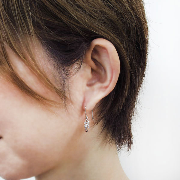 可愛らしい猫と、ゆらゆら揺れて煌めく誕生石がキュートなフックピアスです。