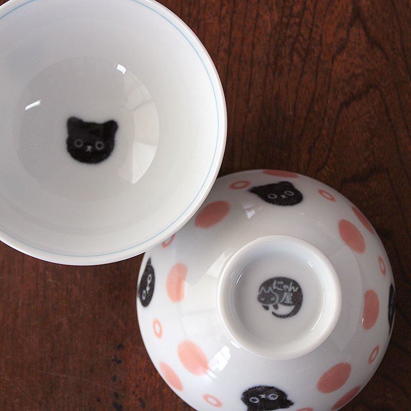 水玉ネコ ご飯茶碗(2色選択) 黒いネコが描かれた小ぶりのご飯茶碗です。