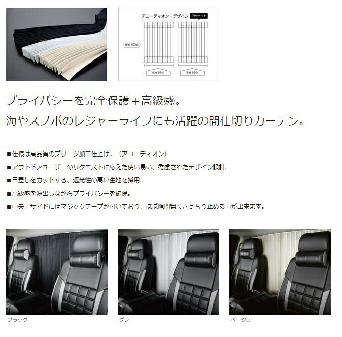 【メーカー名】j-club/ジェイクラブLEGANCE/レガンス【適合車種】トヨタ ハイエース【年式/型式】100系 200系/1型 2型 3型 4型 5型 6型 標準 ナロー ワイド【商品名】汎用間仕切りセンターカーテン&汎用分割ブラックレールセット【セット内容】付属品:カーテンレール78cmx2本/ビスx4本/エンドキャップx2個/天井プラケットx4個/ジョイントx1個/トグラーx4個/ランナーx22個【塗装/未塗装】-【カラー】カーテンカラー:ブラック/グレー/ベージュ レールカラーはブラック【素材】-【特記事項】レール:長さ約78cmx2本/カーテン:縦約100cmx横約95cmx2【定価】15290円【納期】納期はメーカーの在庫や生産状況によって異なりますのでトラブル防止の為、必ず事前にお問い合わせ下さい。