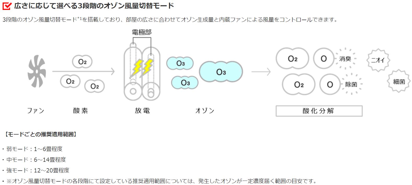 ※3 オゾン:本製品では、日本空気清浄協会が定める室内での許容濃度平均値以下0.05ppm以下に調整されたオゾン風を放出しています。