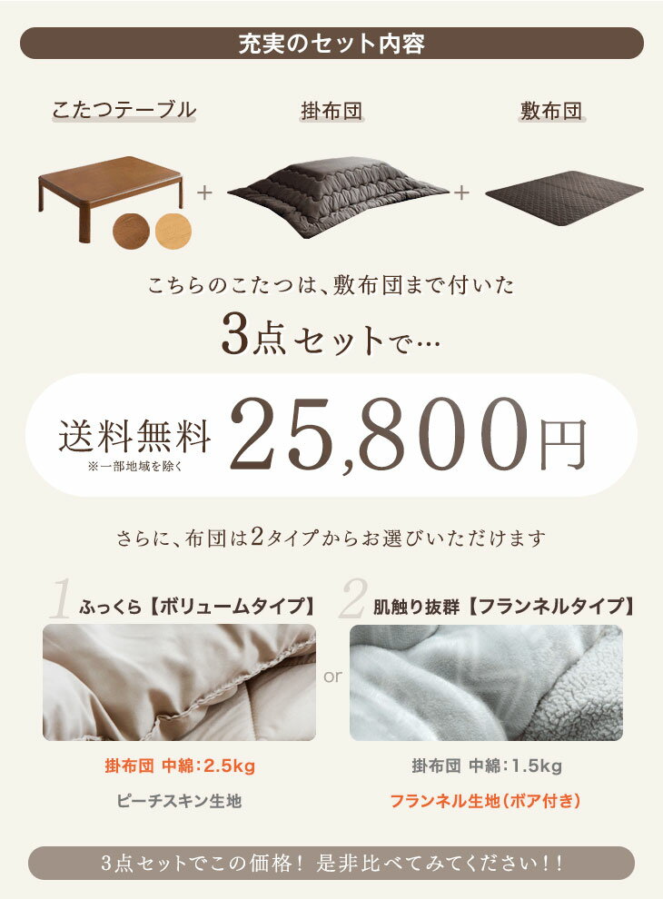 ▼ 単品販売はこちら ▼ 仕様テーブルサイズ外寸:幅120×奥行き80×高さ35.5/40.5cm天板厚:約3cm布団サイズ【掛布団】約240×200cm【敷布団】約240×200cm※対応こたつサイズ:幅105〜120×奥行80〜90cm重量約18kg中綿重量<ボリュームタイプ>約2.5kg<フランネルタイプ>約1.5kg素材天板表面材:MDFダイレクト印刷(UV塗装)脚部・幕板:ラバーウッド(PU塗装)素材<ボリュームタイプ>【掛布団】表地・裏地:ポリエステル100%※ピーチスキン加工中綿:ポリエステル100%【敷布団】表地・裏地:ポリエステル100%中材:ウレタンフォーム、ポリエステル綿<フランネルタイプ>【掛布団】表地・裏地:ポリエステル100%中綿:ポリエステル100%【敷布団】表地・裏地:ポリエステル100%中材:ウレタンフォーム、ポリエステル綿ヒーター□型番:MHU-601E□定格電圧:AC100V□定格周波数:50/60Hz□ヒーター:U字形ハロゲンヒーター□コード長:約3m□消費電力:弱モード…約90W、強モード…約180W□1時間あたりの電気代:弱モード…約2.4円、強モード…約4.9円□安全装置:温度ヒューズ、電流ヒューズカラーブラウン、ナチュラルカラー<ボリュームタイプ>ブラウン、ネイビー、グレー <フランネルタイプ>柄レッド、柄グレー、柄ホワイト生産国インドネシア生産国中国備考【テーブル:組立品(脚のみ取り付け)】※配送は全て宅配便(1人)での玄関渡しとなります。