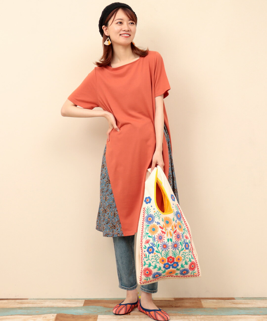フラワープリントが着こなしのアクセントにもなる華やかなマルシェバッグ 存在感たっぷりのフラワー刺しゅう柄がかわいいデザイン。