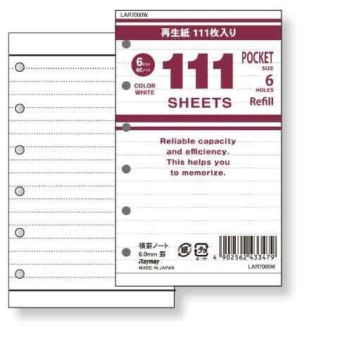 【1000円以上お買い上げで送料無料♪】レイメイ システム手帳 リフィル 徳用 111枚入 ポケットサイズ/ミニサイズ 6穴 横罫 ホワイト - メール便発送