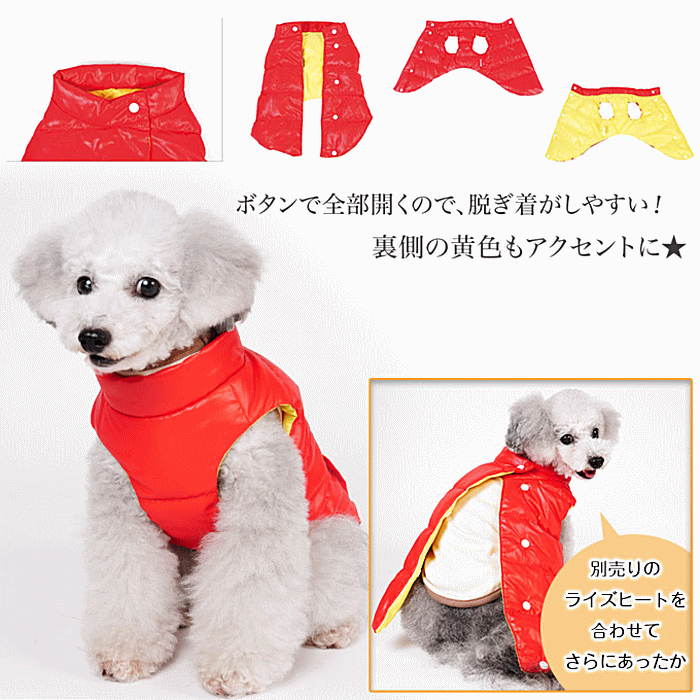 わんちゃんの寒さ対策に!ボタンで全部開くので、脱ぎ着がしやすい!裏側の黄色もアクセントに■素材表地:ポリエステル100%中身:ダウン90%・フェザー10%裏地:ポリエステル100%色合い・素材感についてお使いのパソコンやモニタなどの環境によって、多少の誤差が生じることがあります。