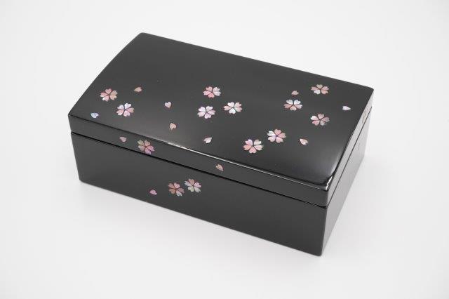 商品名長角小箱 桜(貝入)黒 サイズ18.2×10.6×6.3cm 材質木製・カシュー塗 職人による手作り製品のため、状況によりましては在庫が無くなる場合がございます。