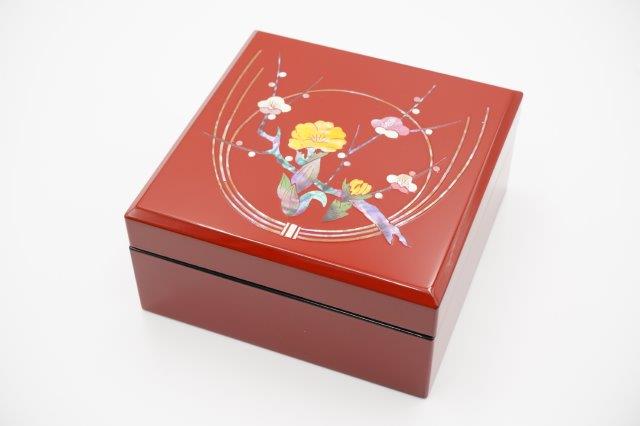 商品名小箱(大)福寿草(貝入)朱 サイズ13.3×13.3×6.3cm 材質木製・カシュー塗 職人による手作り製品のため、状況によりましては在庫が無くなる場合がございます。