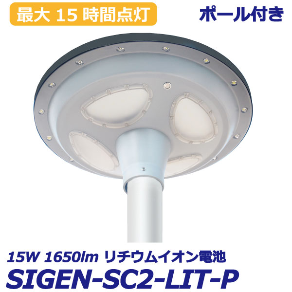 【在庫限り】 15W 1650LM リチウムイオン電池 ソーラー LED 照明 街路灯 ライト 外灯 屋外 自宅 庭 駐車場 駐輪場 街灯 防犯灯 常夜灯 ポール 一体型 円盤型 オート減光 SIGEN-SC2-lit-hp