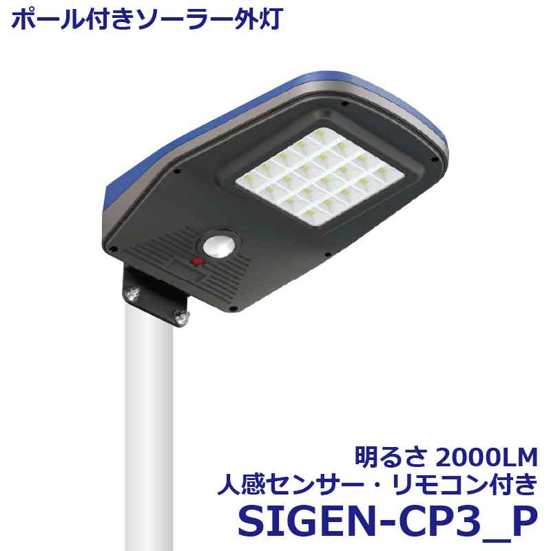ソーラー街灯 外灯 LED ライト 照明 高さ285cm 20W ポールライト センサーライト ガーデンライト 一体型 自動点灯 軽量 コンパクト 街路灯 屋外 庭 駐車場 防犯灯 常夜灯 人感センサー 太陽光 省エネ 配線不要で簡単設置 ソーラー外灯 LED照明 SIGEN-CP3_P