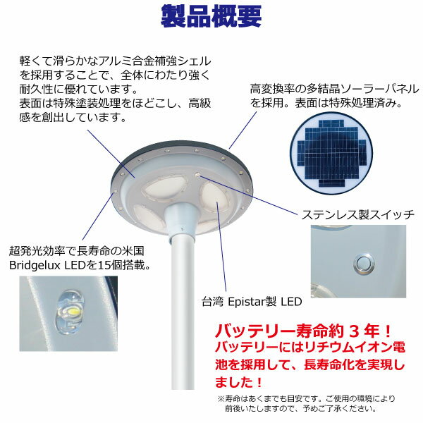--- ソーラー 高輝度 LED 照明 ライト ポール灯 ガーデンライト 玄関灯 門灯 街路灯 外灯 街灯 常夜灯 庭園灯 防犯灯 庭 駐車場 駐輪場 屋外 校庭 公園 遊歩道 湖畔 災害 停電 防犯 ソーラー 太陽光 省エネ ソーラーパネル バッテリー一体型 リチウムイオン電池 防水 防塵 IP65 エコ ルーメン lm 送料無料 おしゃれ 明るい 円盤型 丸い キャンプ場 ビアガーデン 電気代不要