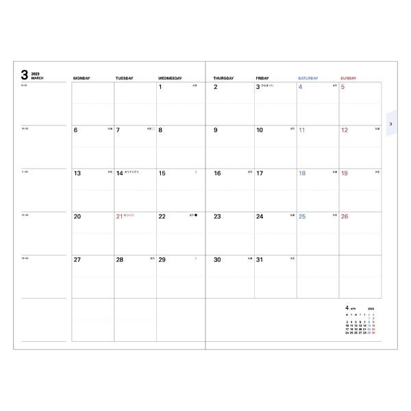 手帳本体 サイズ 手帳本体 仕様 本体サイズB6変型(180×120mm) ページ数176ページ 仕様糸かがり綴じ 本文用紙オリジナル手帳用紙 NEO AGENDA(森林認証紙) 生産国日本製 レイアウト12月始まり/月曜始まり 月間ページブロックタイプ 月間ページ掲載期間 2022年12月~2024年3月 掲載内容 月間ページ大安・仏滅・友引表示、ムーンカレンダー表示、ウィークナンバー、マンスリーメモ32ページ その他2022/2023/2024見開きカレンダー、年間カレンダー、方眼罫ノートページ105ページ、ID&PASSWORD、パーソナルデータ