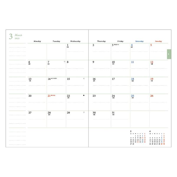 【10月始まり/64ページ】 ◎カバー付きサイズ/H188xW133xD7mm ◎重さ/約135g ◎カバー仕様/取り外し可能・塩ビ製カバー・カードスリット・ペンホルダー付 ◎スピン1本付手帳本体 サイズ 手帳本体 仕様 本体サイズB6正寸(182×128mm) ページ数64ページ 仕様糸かがり綴じ 本文用紙オリジナル手帳用紙 NEO AGENDA(森林認証紙) 生産国日本製 レイアウト10月始まり/月曜始まり 月間ページブロックタイプ 月間ページ掲載期間2022年10月〜2024年1月 掲載内容 月間ページ大安、仏滅、友引表示、ムーンカレンダー表示 その他2022/2023/2024 見開きカレンダー、罫線メモ20ページ、ID&PASSWORD、パーソナルデータ 巻末情報 世界地図/時差表、国内9都市地下鉄路線図
