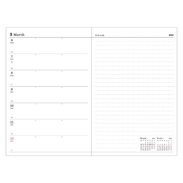 【12月始まり/192ページ】 ◎カバー付きサイズ/H185xW125xD12mm ◎重さ/約180g ◎カバー仕様/取り外し可能・金具パーツ付塩ビ製カバー・カードスリット・ペンホルダー付 ◎スピン2本付1週間のおおまかな予定を把握しつつ 週単位でTO DOやメモを書ける週間レフト 予定とメモのバランスがちょうどいい、ウィークリーページ 1日の予定が少ない、または予定管理はデジタル中心で自己管理用におおまかな予定を記入して、手帳は週単位のタスク管理やメモ用に使いたい、そんな人におすすめなのが週間レフトタイプ。