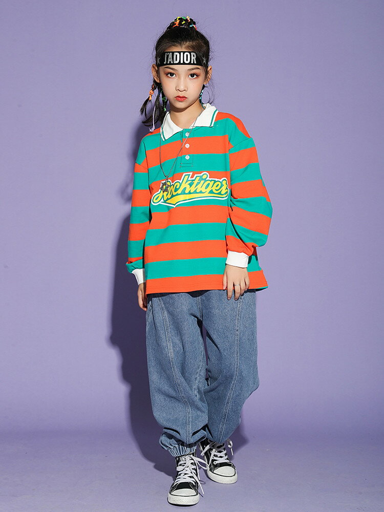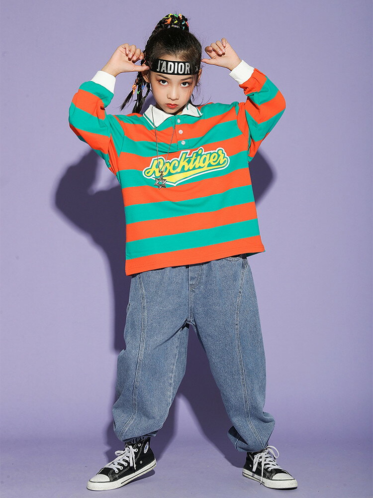 ダンス衣装 キッズ セットアップ 男女兼用 トップス デニムパンツ ヒップホップ トレーナー 男の子 女の子 長袖tシャツ チアガール 子供服 派手 ストリート 原宿系 レッスン ダンスウェア ユニセックス ジャッズ hiphop 110 120 130 140 150 160 170 180