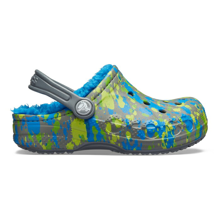 特徴的なプリントが施されたこの秋冬用クロッグのキッズモデルは、ふわふわしたフリースのようなライニングでつま先を暖かく保つ室内外兼用のスタイル。