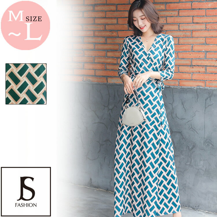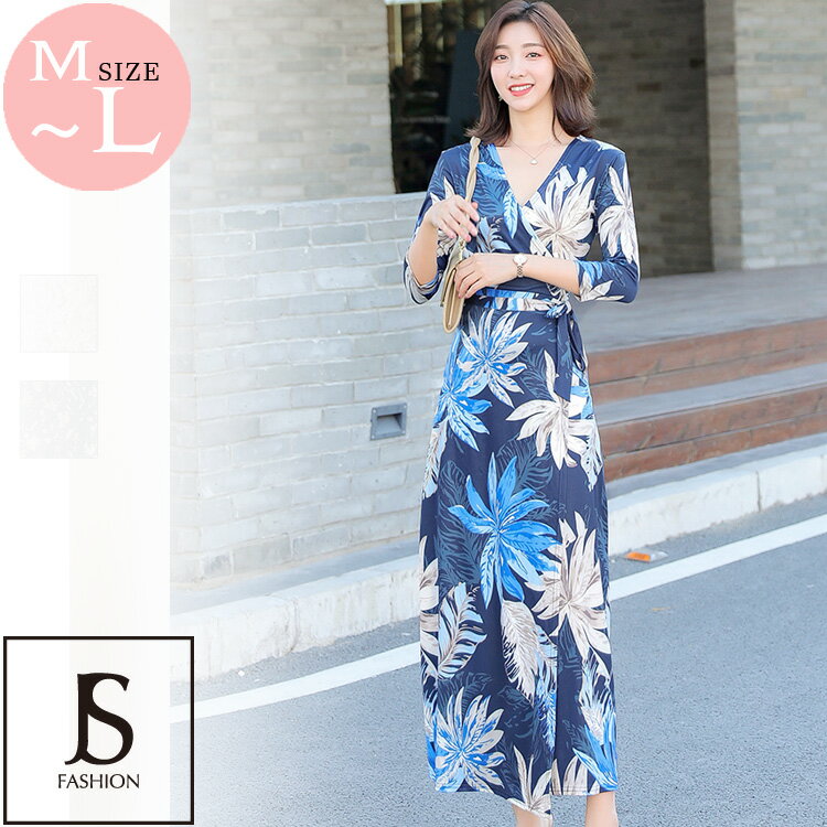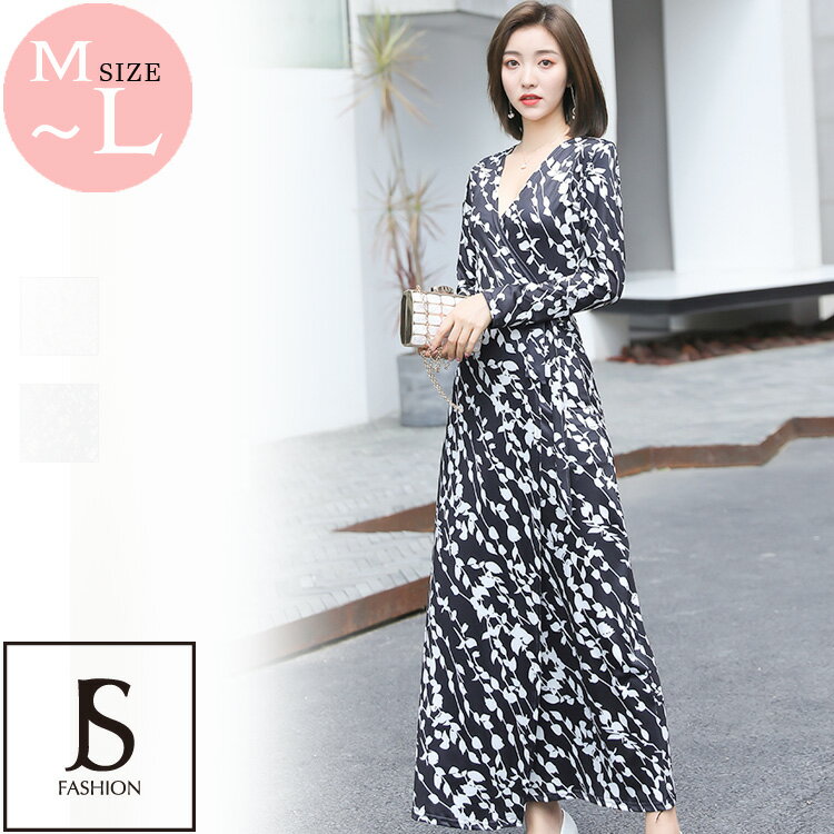カシュクールワンピース 総柄 柄プリント ロングワンピース ロング丈 マキシ丈 袖あり マキシワンピ ラップワンピース きれいめ リゾートワンピ 細見え 華やかおしゃれ 大人セクシー Mサイズ Lサイズ 大人可愛い JSファッション【210803】【8月新作】